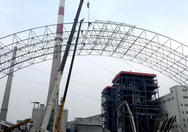 7) 平面鋼桁架的特點:常規(guī)的屋面體系為平面受力體系,平面外的剛度及穩(wěn)定靠復雜的支撐體系來保證,支撐的桿件強度得不到充分的發(fā)揮,因此耗鋼量大。且桿件類型、規(guī)格繁多,節(jié)點種類多而復雜。體系傳力路線長,節(jié)點連接部分薄弱,容易應力集中,對抗震及抵抗行車的水平力、約束汽機房外側(cè)柱均不利。鋼桁架、屋面板自重大,需大型機械進行安裝。